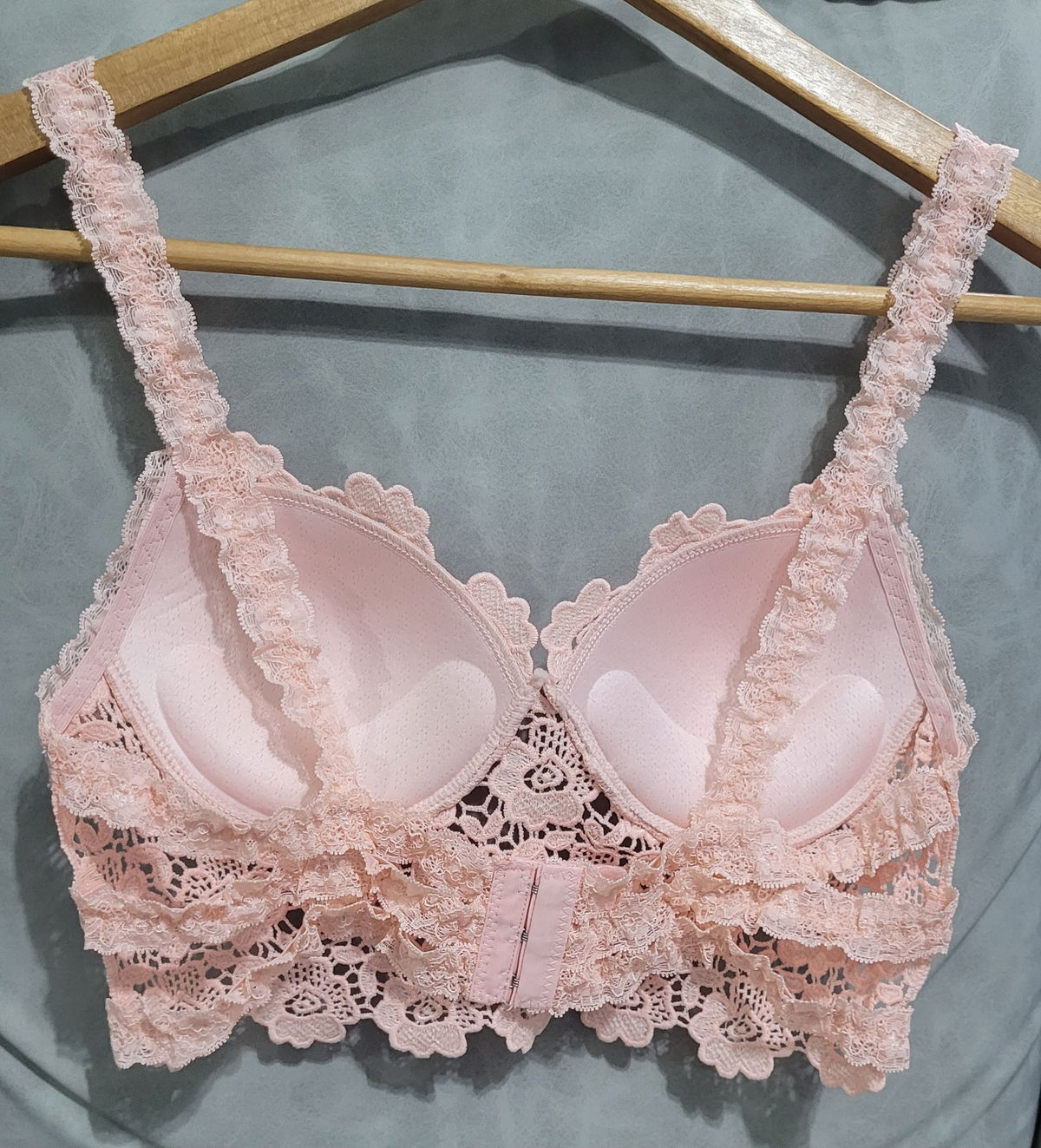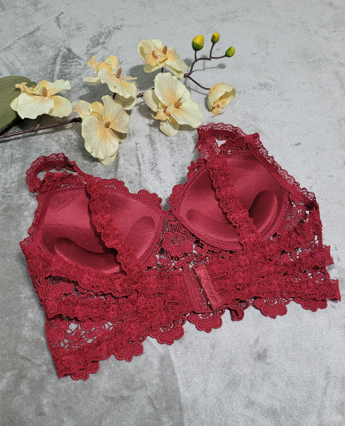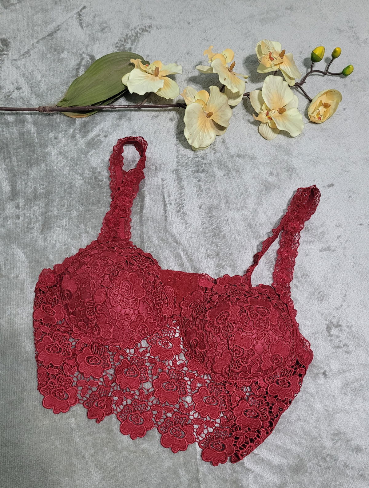 Corpiño forrado de broderie con falso aro, detalles en puntilla y en espalda, breteles elásticos, relleno soft. Calidad premium