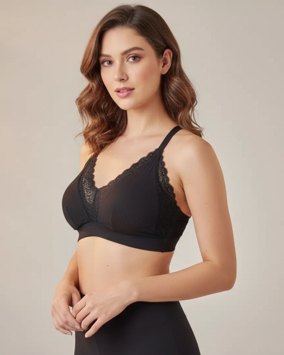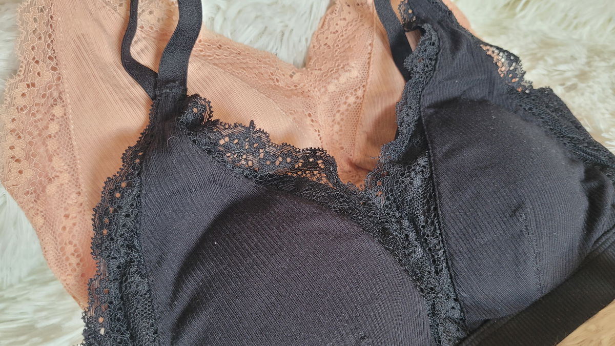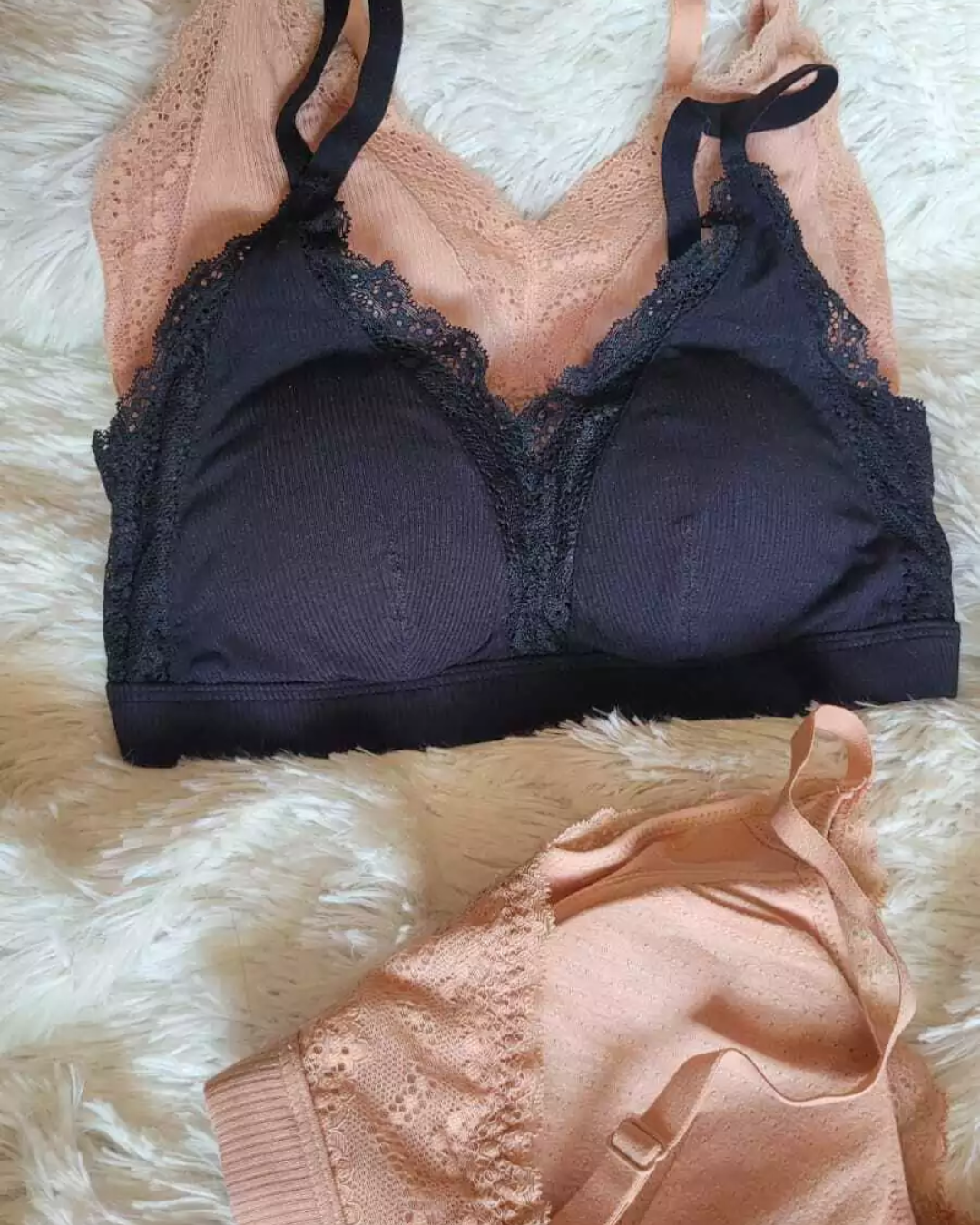 Corpiño forrado con puntilla, breteles regulables y tasas desmontables.