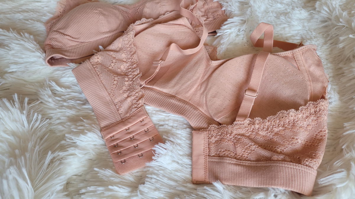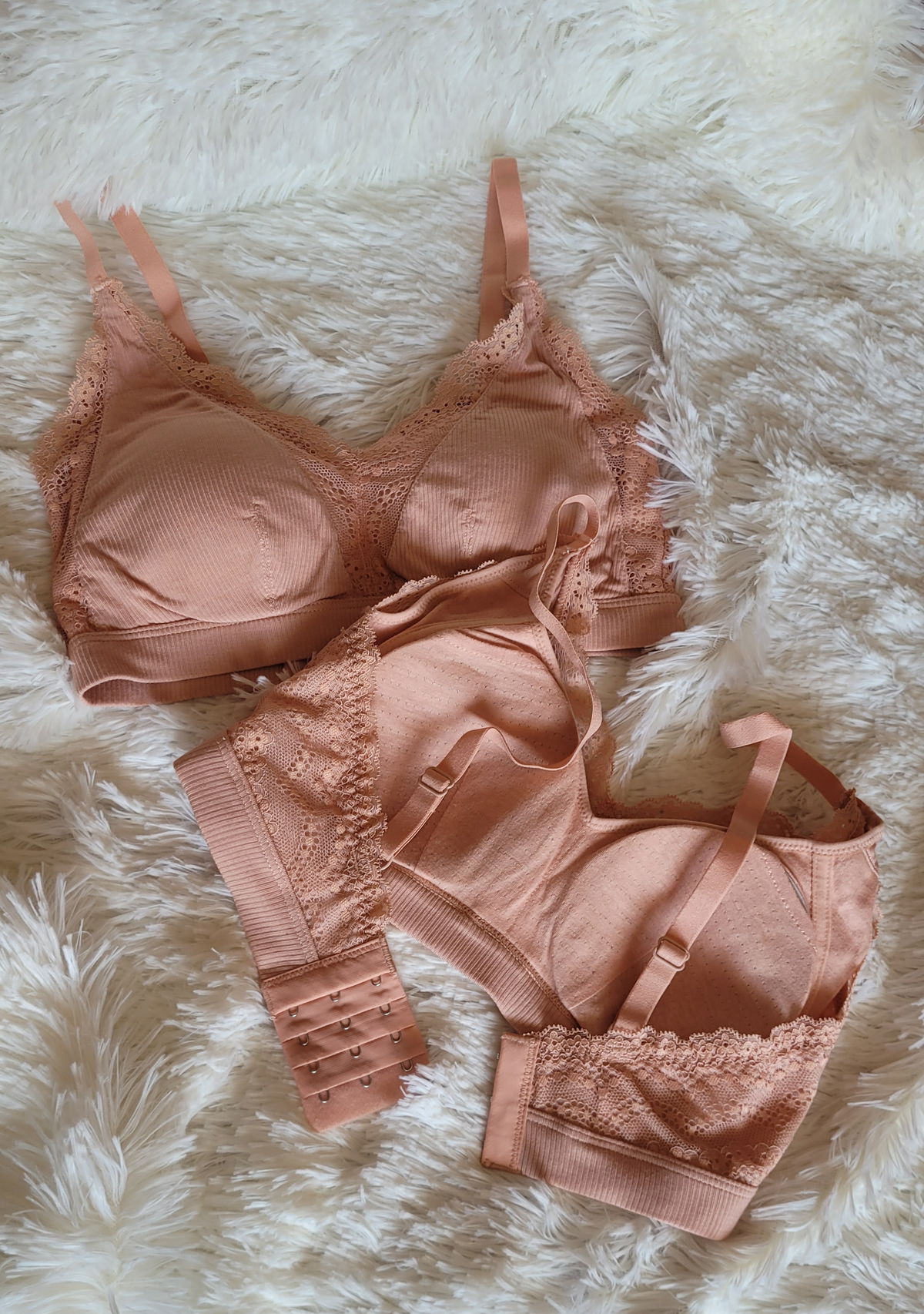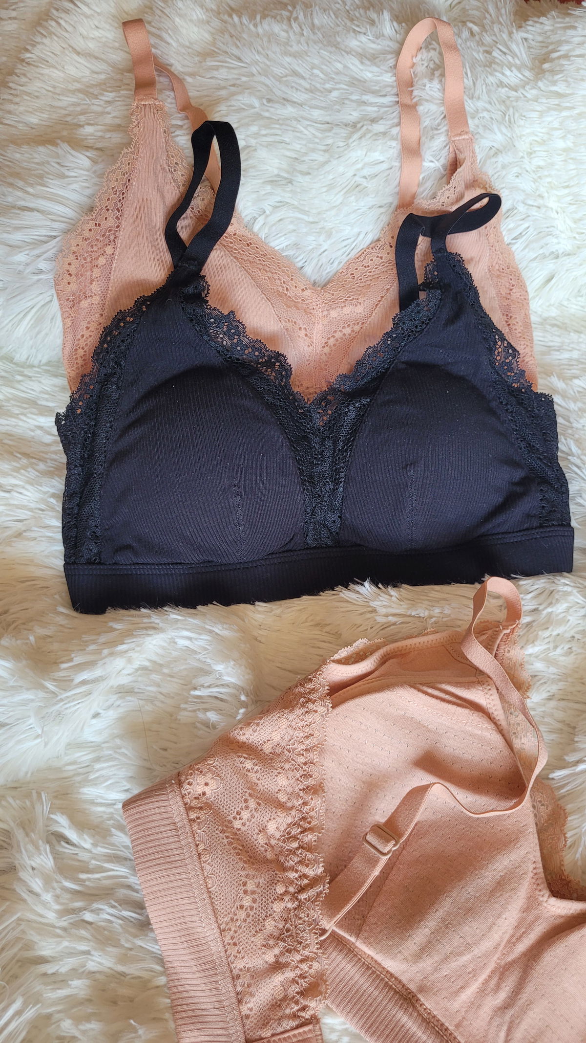 Corpiño forrado con puntilla, breteles regulables y tasas desmontables.