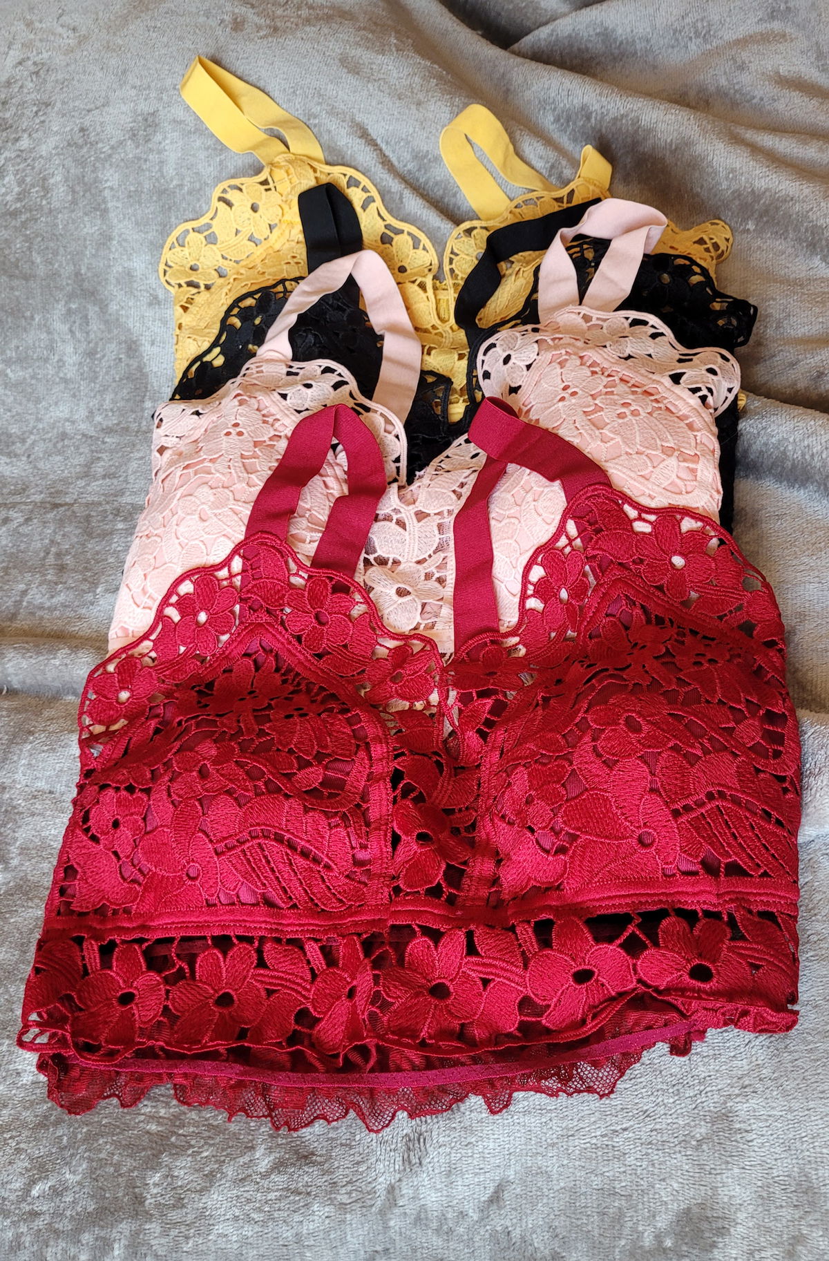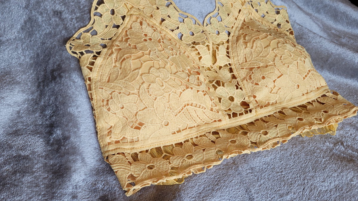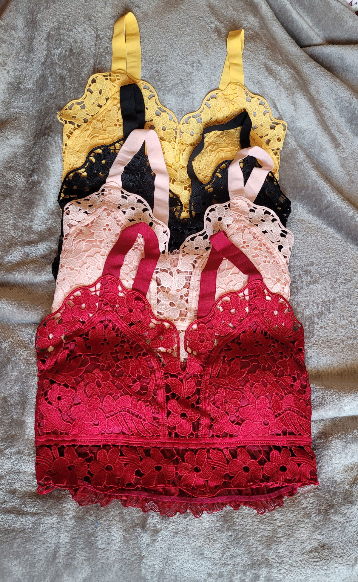 Top forrado tejido con apliques de flores, detalle con espalda fruncido, breteles anchos hipoalergènicos, tasas forradas en algodón desmontables.