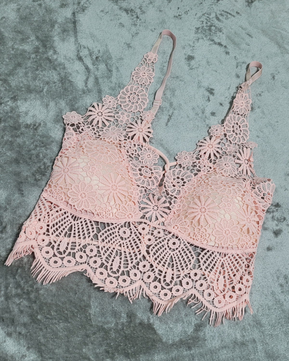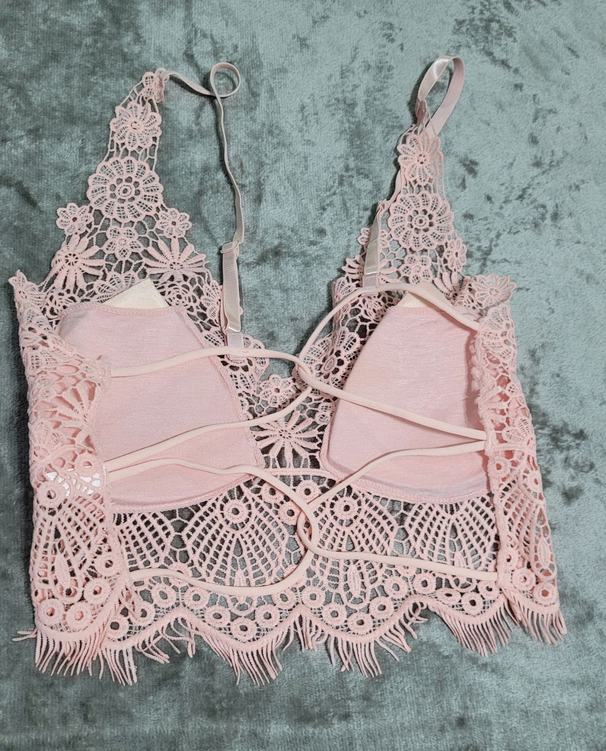 Top forrado de broderie con aplique de flores, puntilla elasticida, tiras elásticas finas cruzadas en espalda haciendo juego. Tasas forradas desmontables