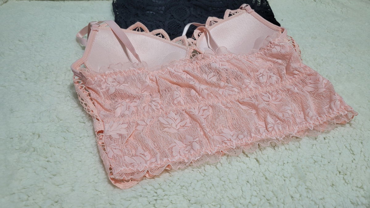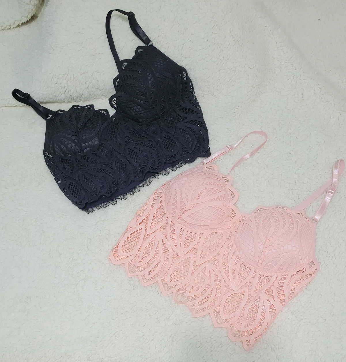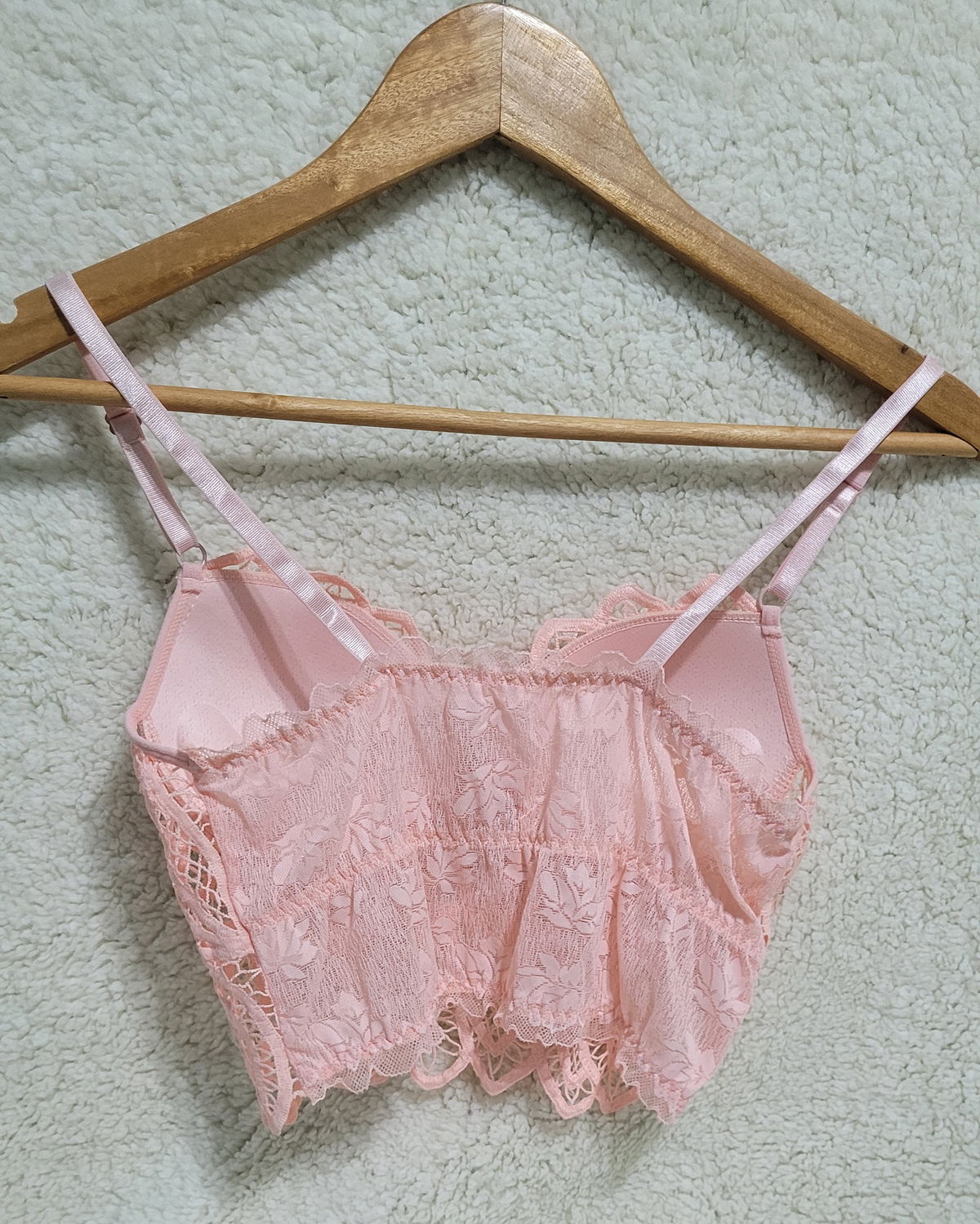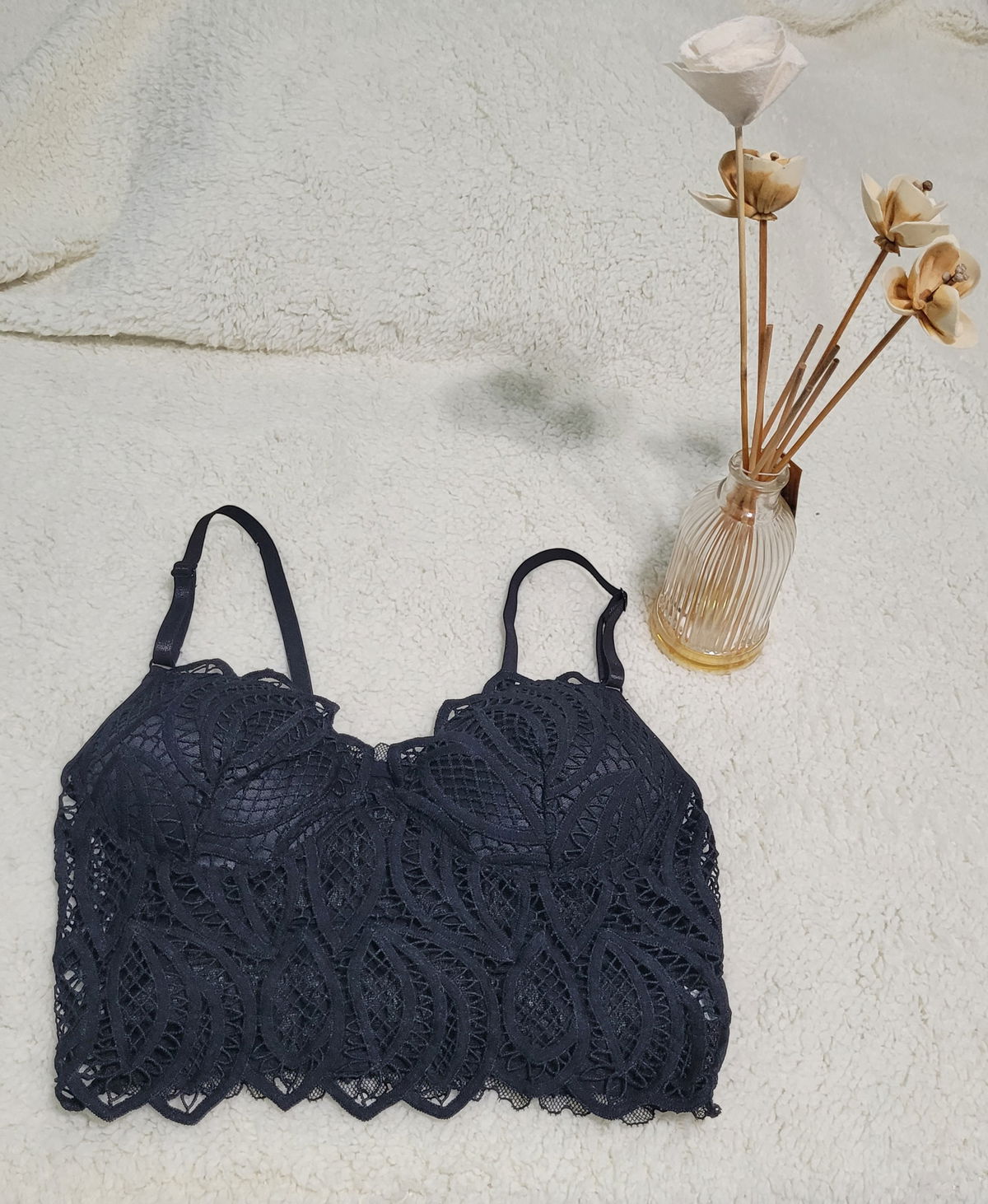 Top forrado de broderie con falso aro soft, detalles de puntilla en espalda. Breteles regulables. Tasas no desmontables. Línea premium