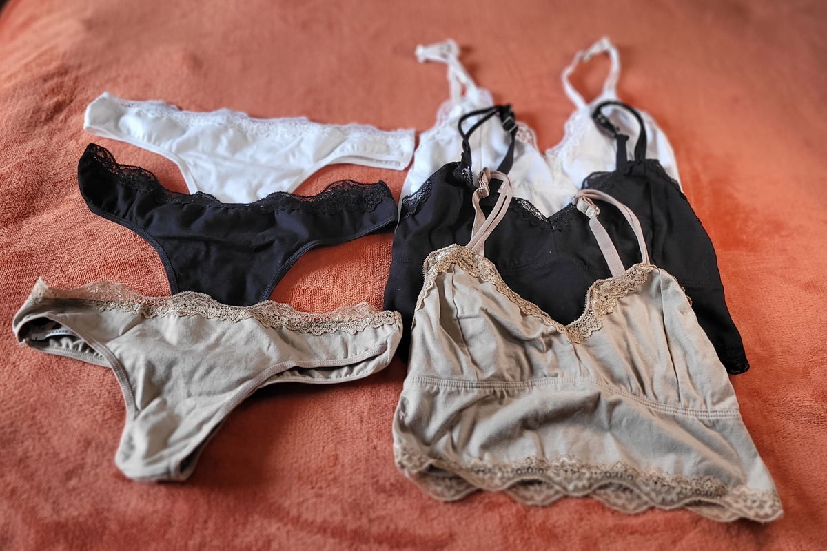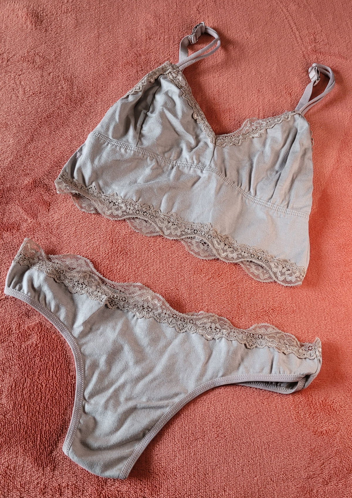 Conjunto de algodòn con breteles regulables y puntilla fina. Espalda cerrada tipo top, sin aros ni tasas. Colaless haciendo juego.
