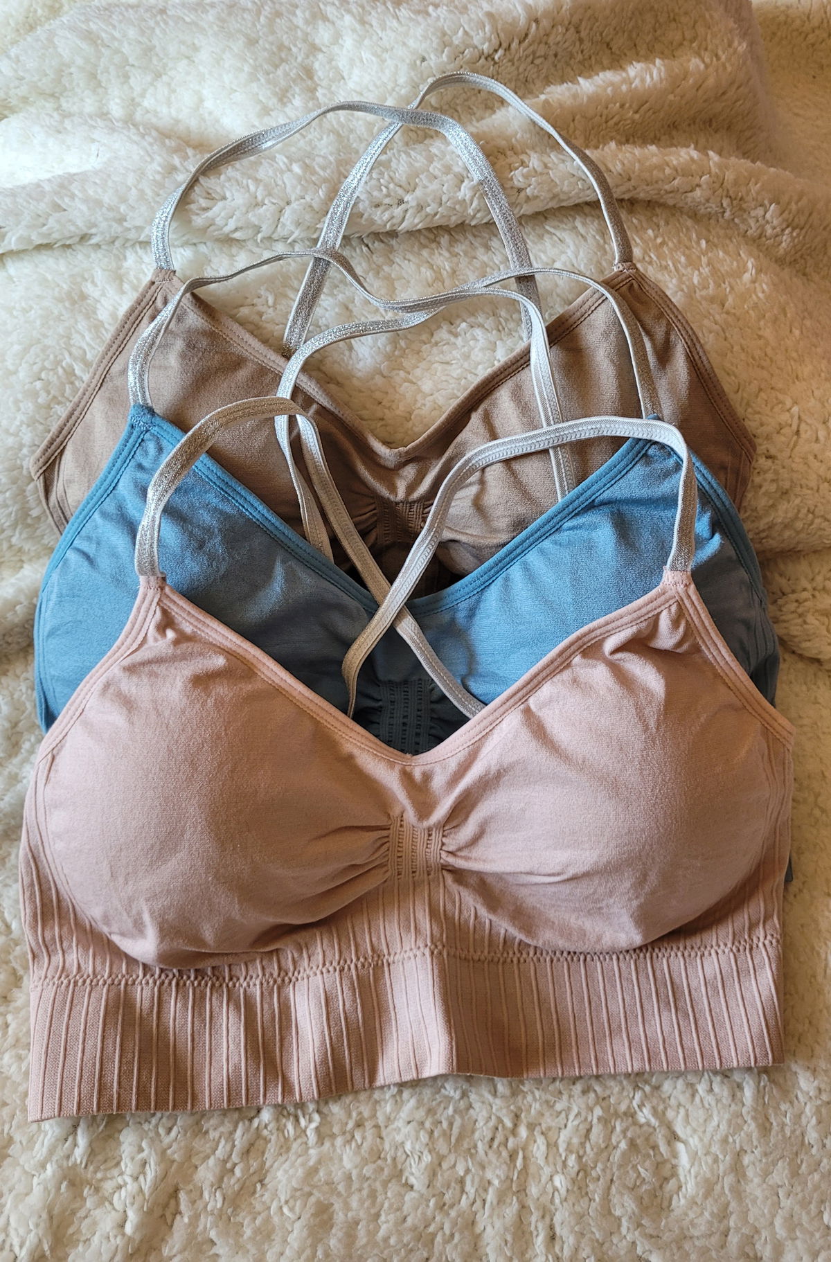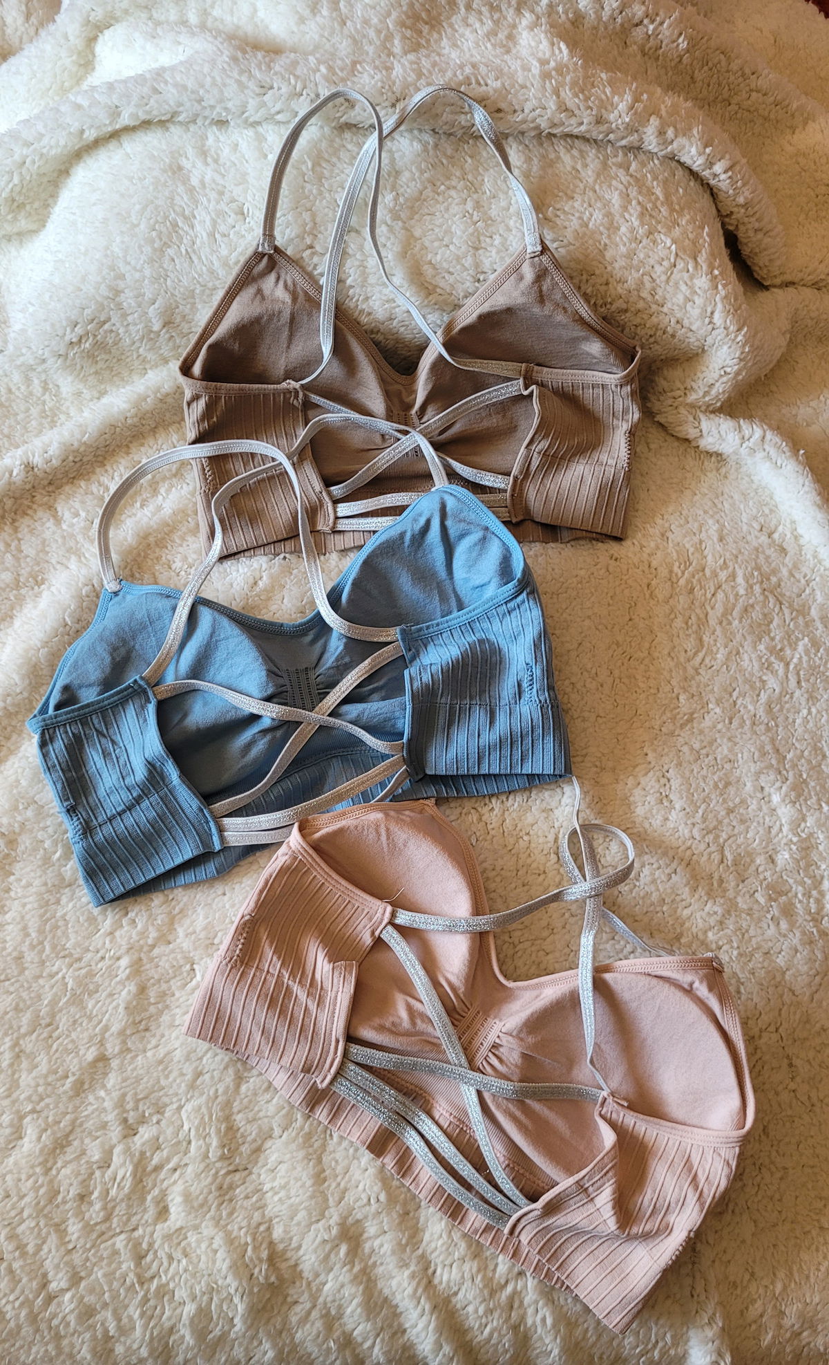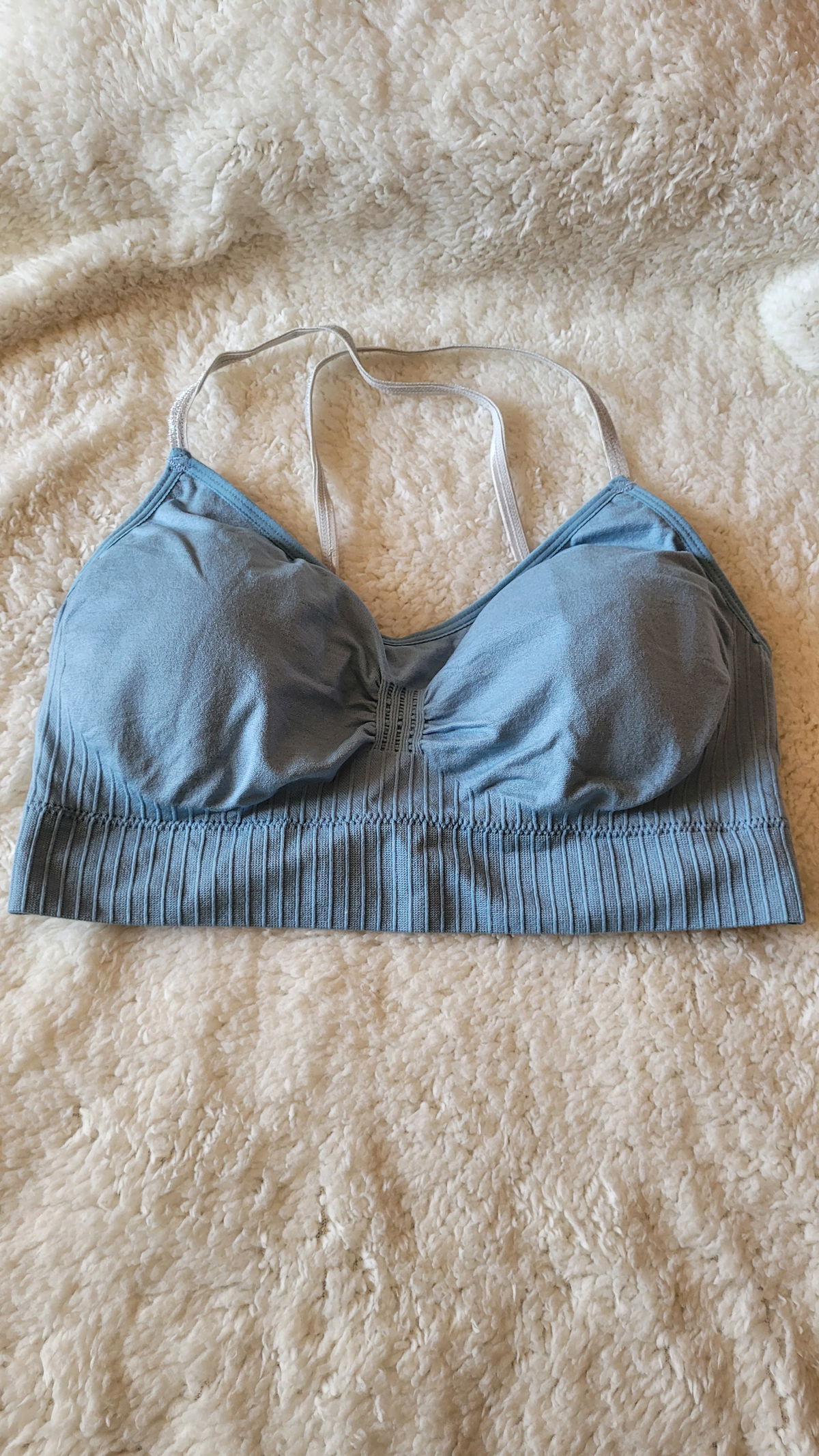 Top con espalda de tiras cruzadas con breteles elásticos con brillo, no regulables, tasas desmontables. Muy cómodo y suave
