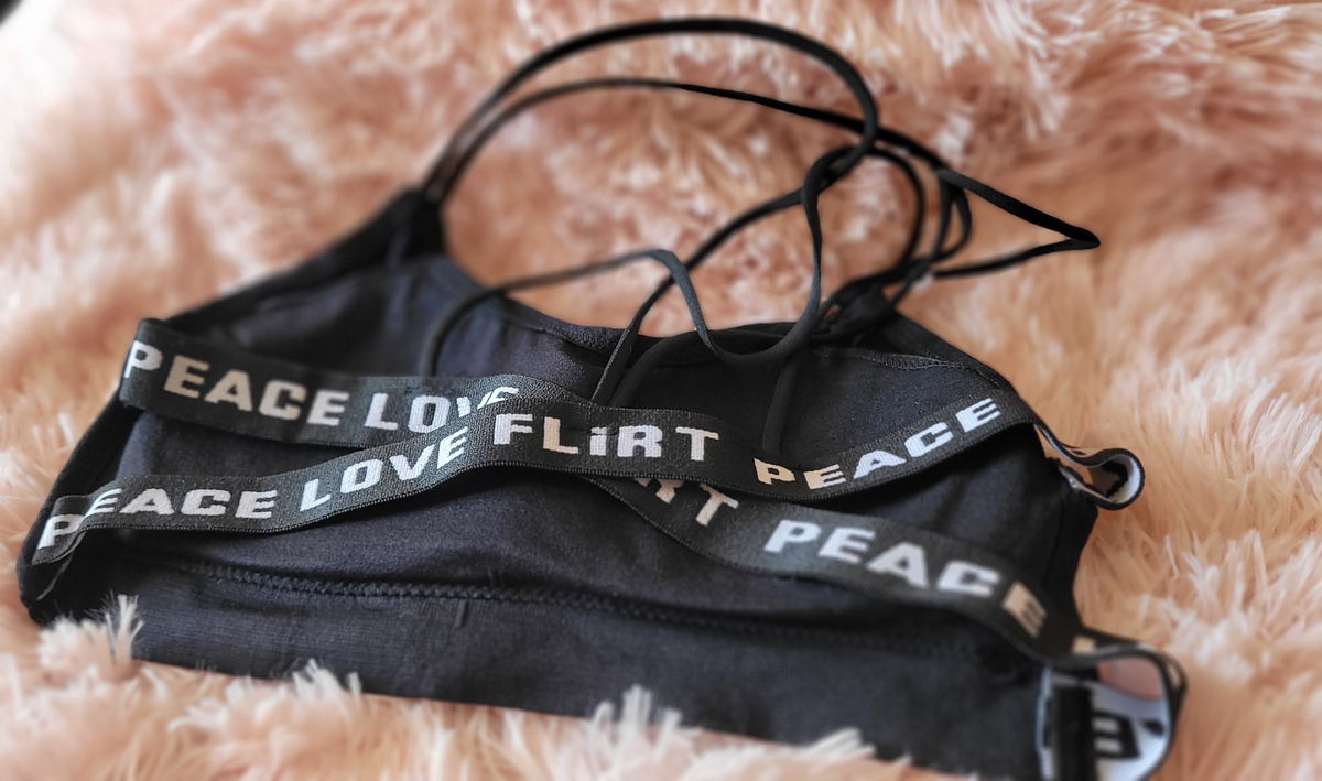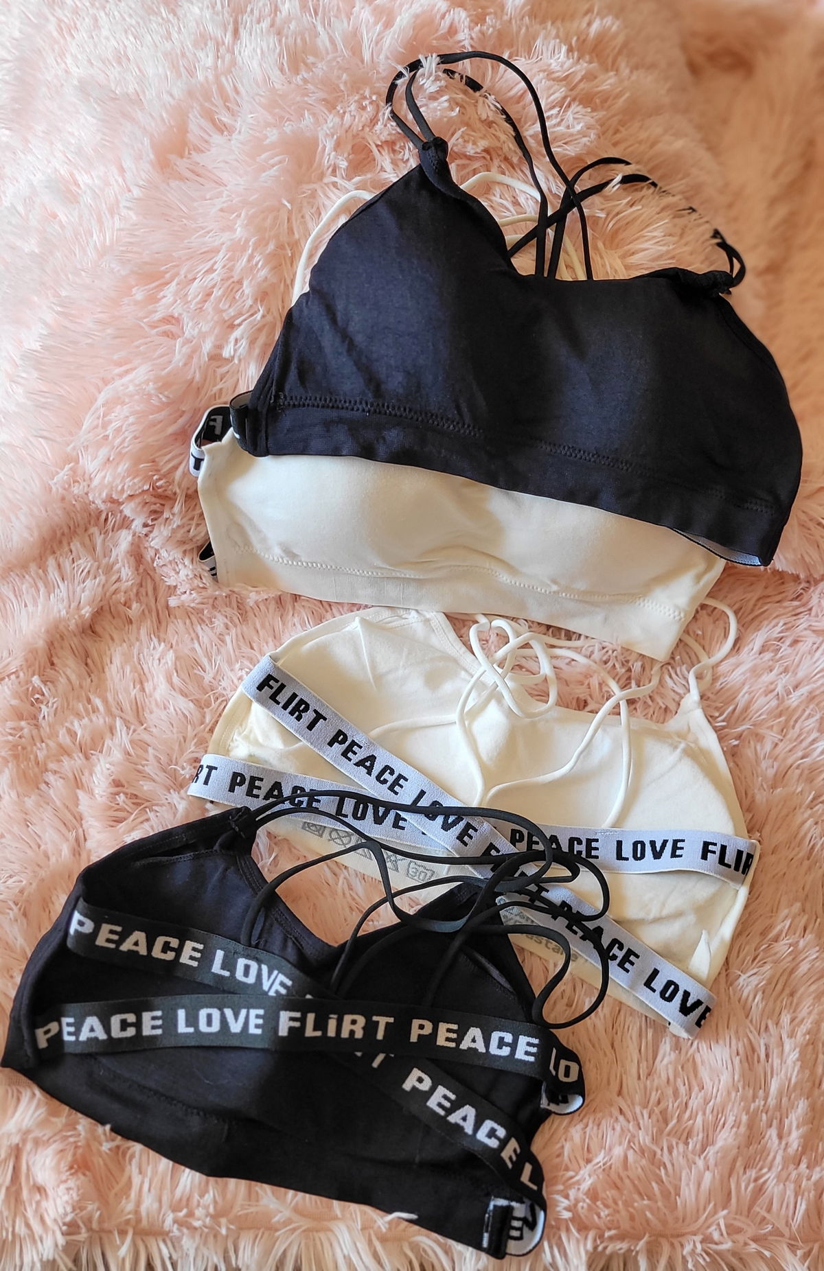 Top forrado con tasas desmontables. Breteles con tiras finas elásticas cruzadas en espalda y 2 bandas elásticas anchas con escrito .