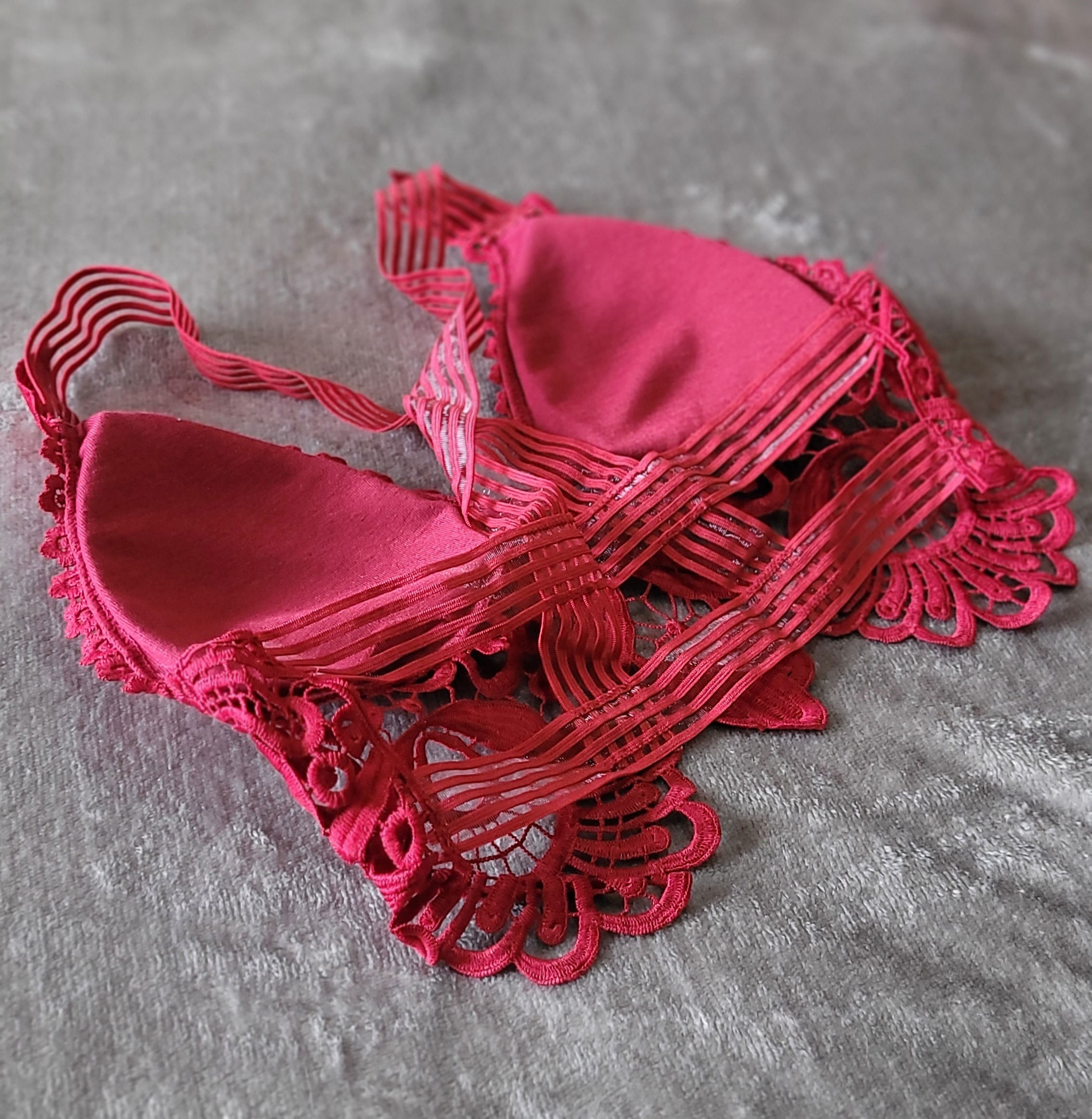 Top forrado en broderie con apliques, detalle en espalda con breteles de cinta de tul elastizado. Tasas desmontables